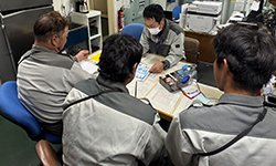 各船舶において定期的に会社の担当者が訪船を実施。基本作業に対する確認と通達文書の確認(最近の事故トラブル事例・ヒヤリハット事例など)を行い、乗組員と意見交換を実施し「安全意識の再確認」と「安全意識の更なる改善・向上」に取り組んでいます。また、乗組員の今後の配乗計画の動向などの打ち合わせを行い、船内のコミュニケーション、乗組員同士の人間関係を把握し、船内融和が維持できるように努めています。